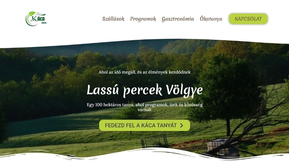 Természetközeli hangulatú weboldal ökogazdaság és programok bemutatására, a nyugalom és a közösségi élmények élményére építve.